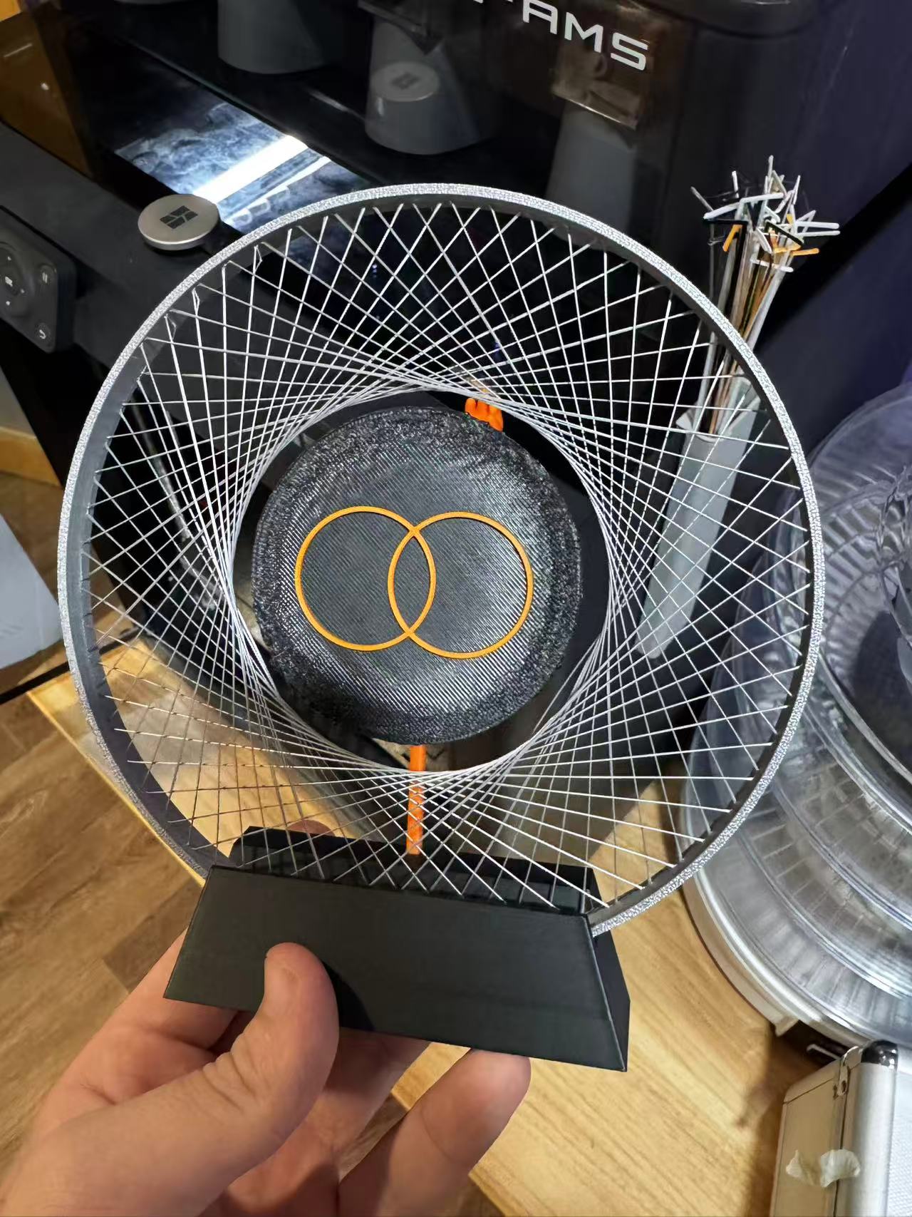 For this particular design, a technique in 3D printing called bridging is used. the outer ring is formed completely by bridging three times at each layer and rotate a fixed angle for the next layer, forming a complex 3D web-like pattern. The plate in the middle is supported by a single rod attached to the base, to further strengthen the feeling of “floating” of the center plate. On the plate is the two intercrossing circle, indicating an abstraction our school’s logo and also the connection between us and them.