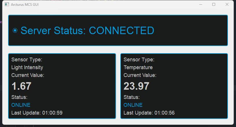 The Arcturus MCS GUI is a software demonstration designed to demonstrate clients the actual GUI: a simple, intuitive interface to access all data from . The demo GUI combined a Python-based socket server, an MQTT client, and a graphical user interface (GUI) into a single, cohesive application.